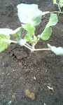 ↑手前ブロッコリー(7根目)の白くなった葉(土寄り)を取り除き、ひとつ先(8根芽※いずれも同路面を基準)の白い葉は残しました。スーパーで買ったキャベツの葉の大きいもの(普通の1.5倍)の外側の葉は青く食べれないが中が大きく育っていた(隣比べ)ので多少傷の葉が結果的に良い作物を生む可能性を実地トライ。